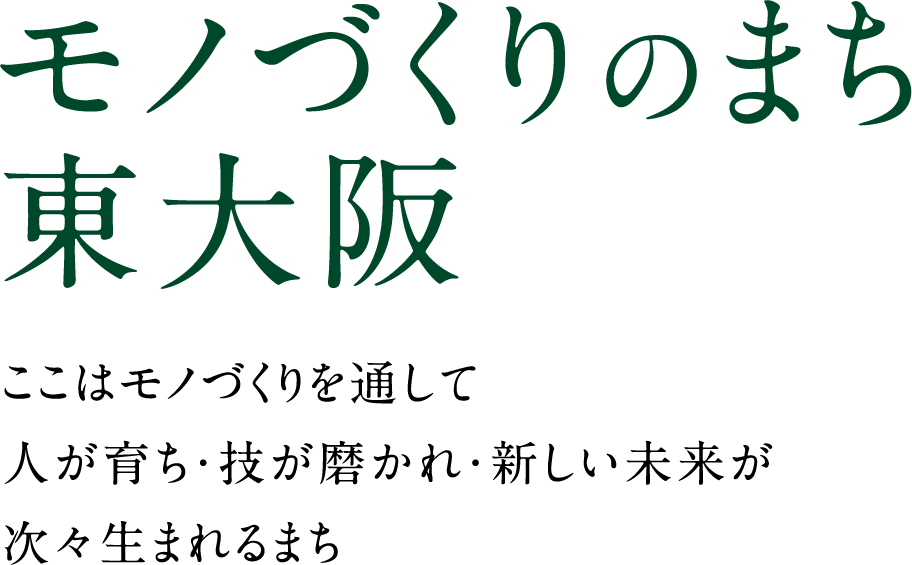 東大阪市は、大阪市の東に隣接した人口約48万人の中核市。市内を近鉄奈良線・大阪線・けいはんな線、地下鉄中央線、JR学研都市線・おおさか東線が走り、国道や阪神高速など道路網も発達。関西経済の中心地に隣接する交通の利便性が、「モノづくり」には格好の地として高い技術力を誇る多種多様な中小企業が集まっています。