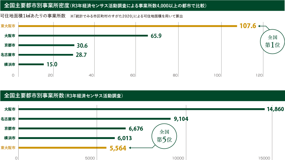 ちなみに、可住地面積に対する事業所密度は全国 1 位、また事業所の数も政令指定都市を除くと全国 1 位(R3年経済センサス活動調査による工場数4000以上の都市で比較)と数字にも表れているように東大阪は言わずと知れた「モノづくりの先進都市」なのです。