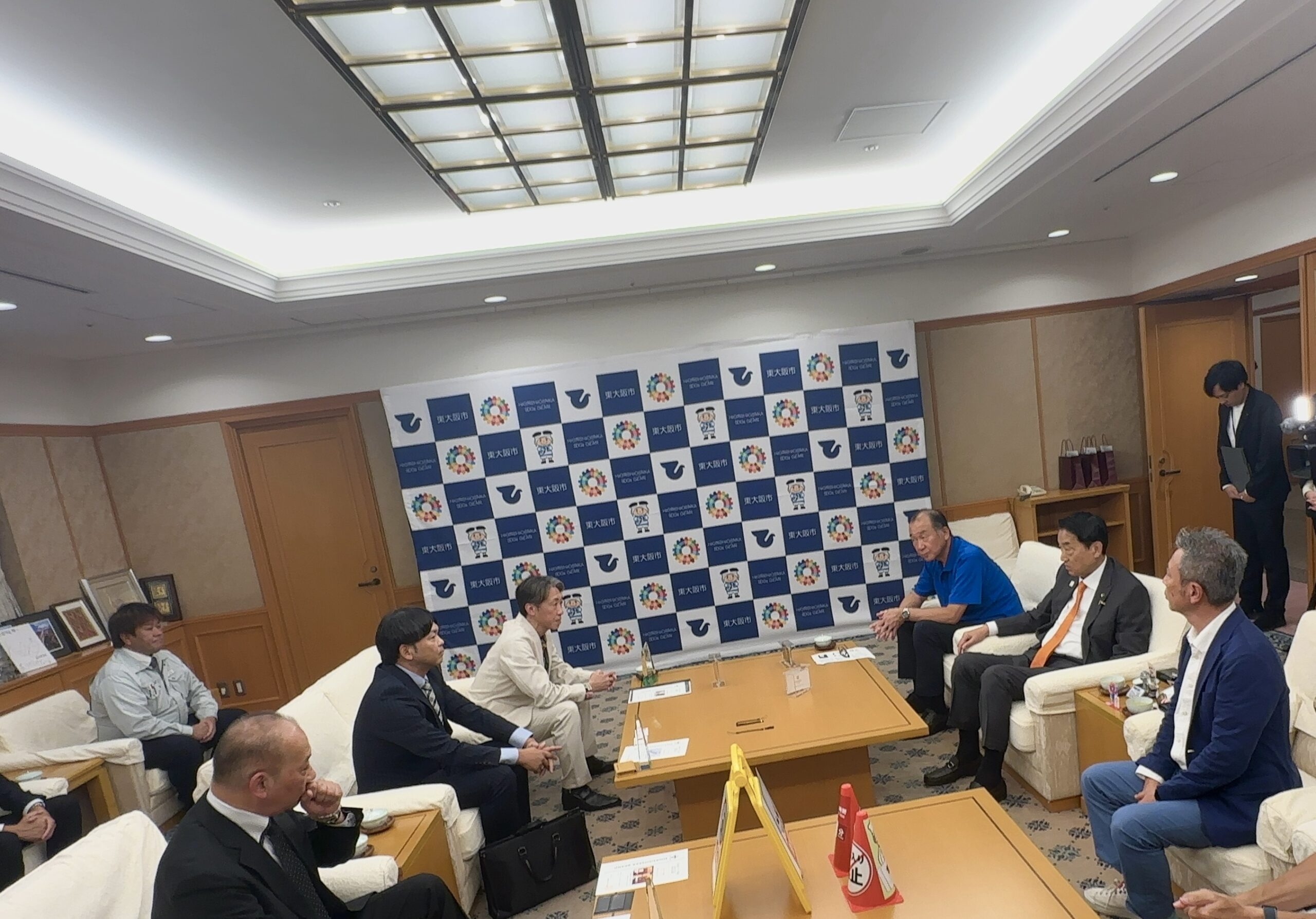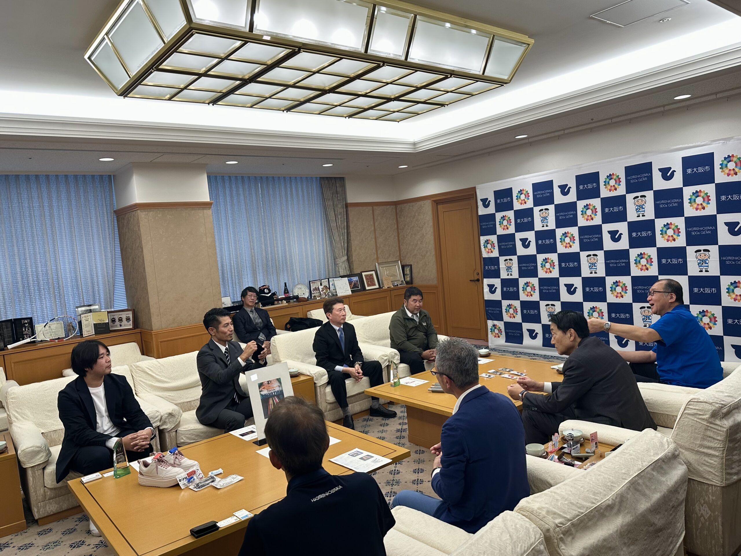 その後、野田市長、山本副市長、東大阪ブランド推進機構・理事長の河北理事長と認定製品について意見交換が行われました。